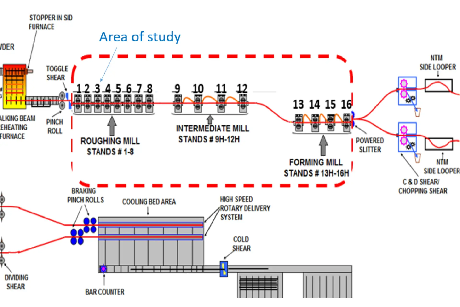 The New Bar Mill was established in the year 2005 to produce long products, i.e., TMT (Thermo Mechanically Treated) bars. It rolls billets having a cross-section of 150×150 mm² and a length of 12 m into TMT bars having a wide range of diameters, i.e., 8 mm, 10 mm, and 12 mm, by the process of Hot Rolling in the Fig. below.