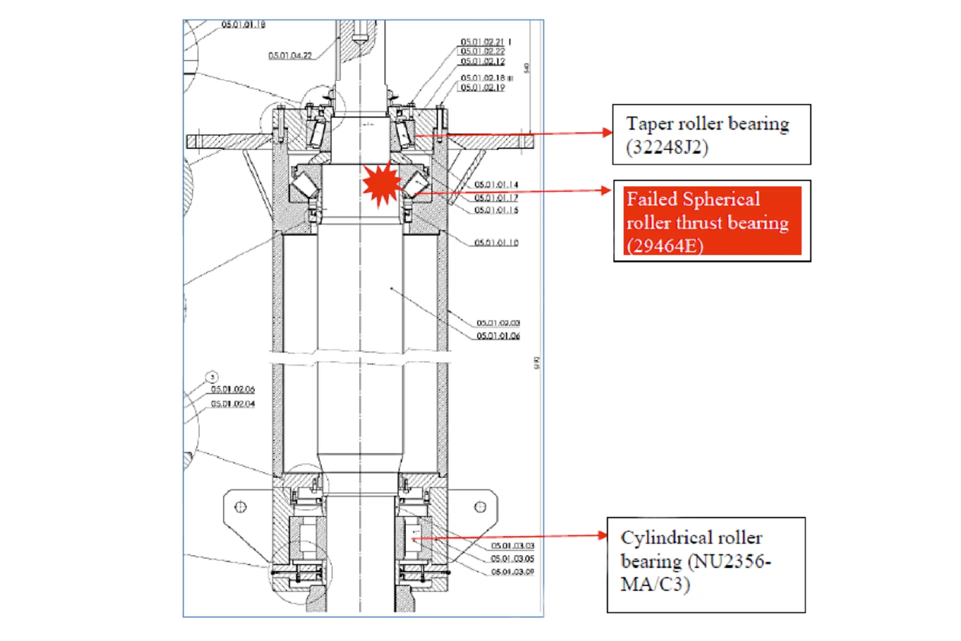 - Inadequate sealing arrangement at the bottom of the SRT bearing causing less quantity of grease in the middle bearing led to severe wear in raceway and rolling elements. The grease was leaking out from the bottom seal and did not follow the grease return path.