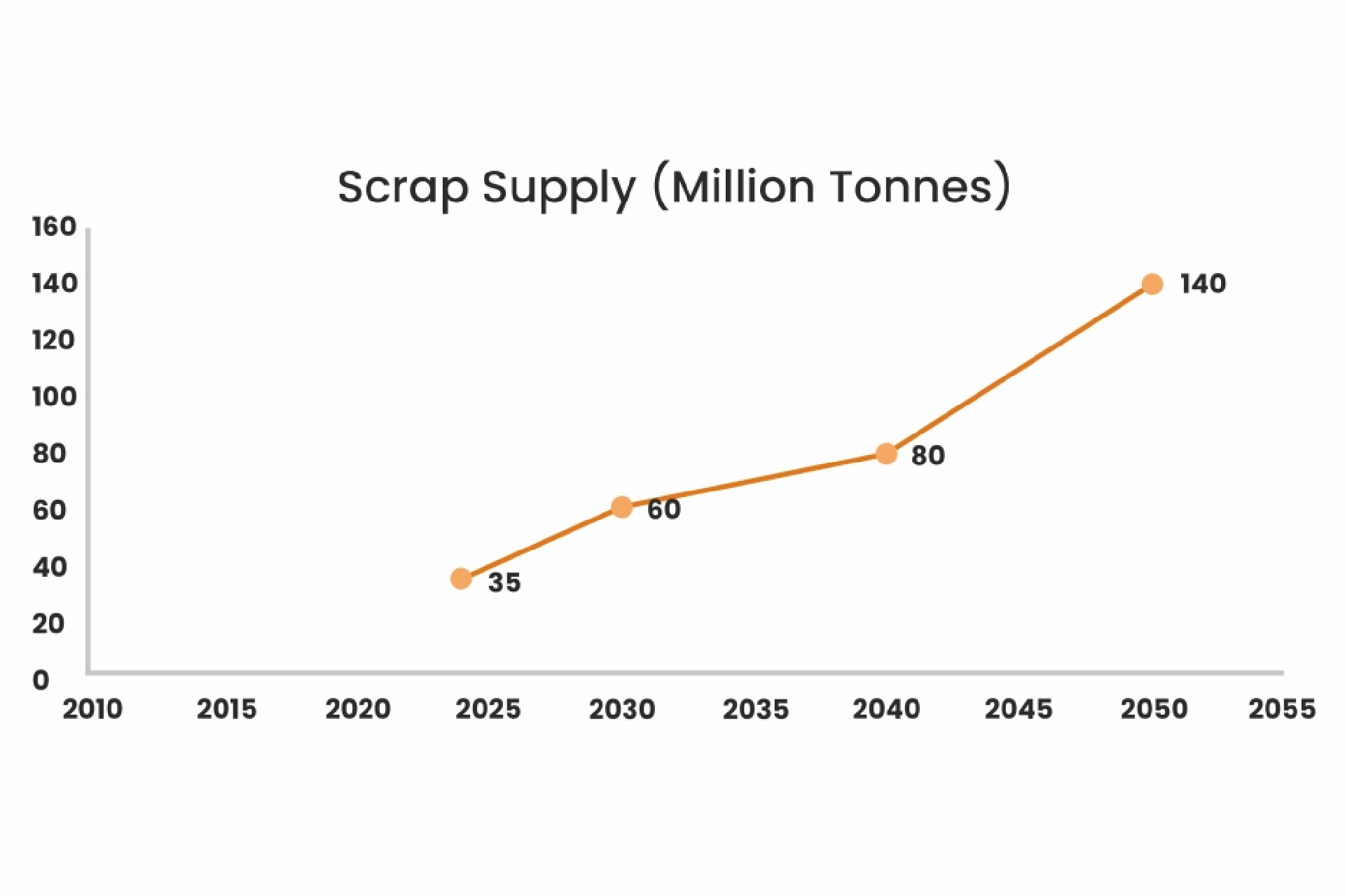 - Scrap: Current supply is 30–35 million tonnes per year, while demand is 35–40 million tonnes, forcing imports. By 2050, however, scrap availability is projected to jump to 130–140 million tonnes annually, powered by end-of-life vehicles, consumer goods, and infrastructure recycling.