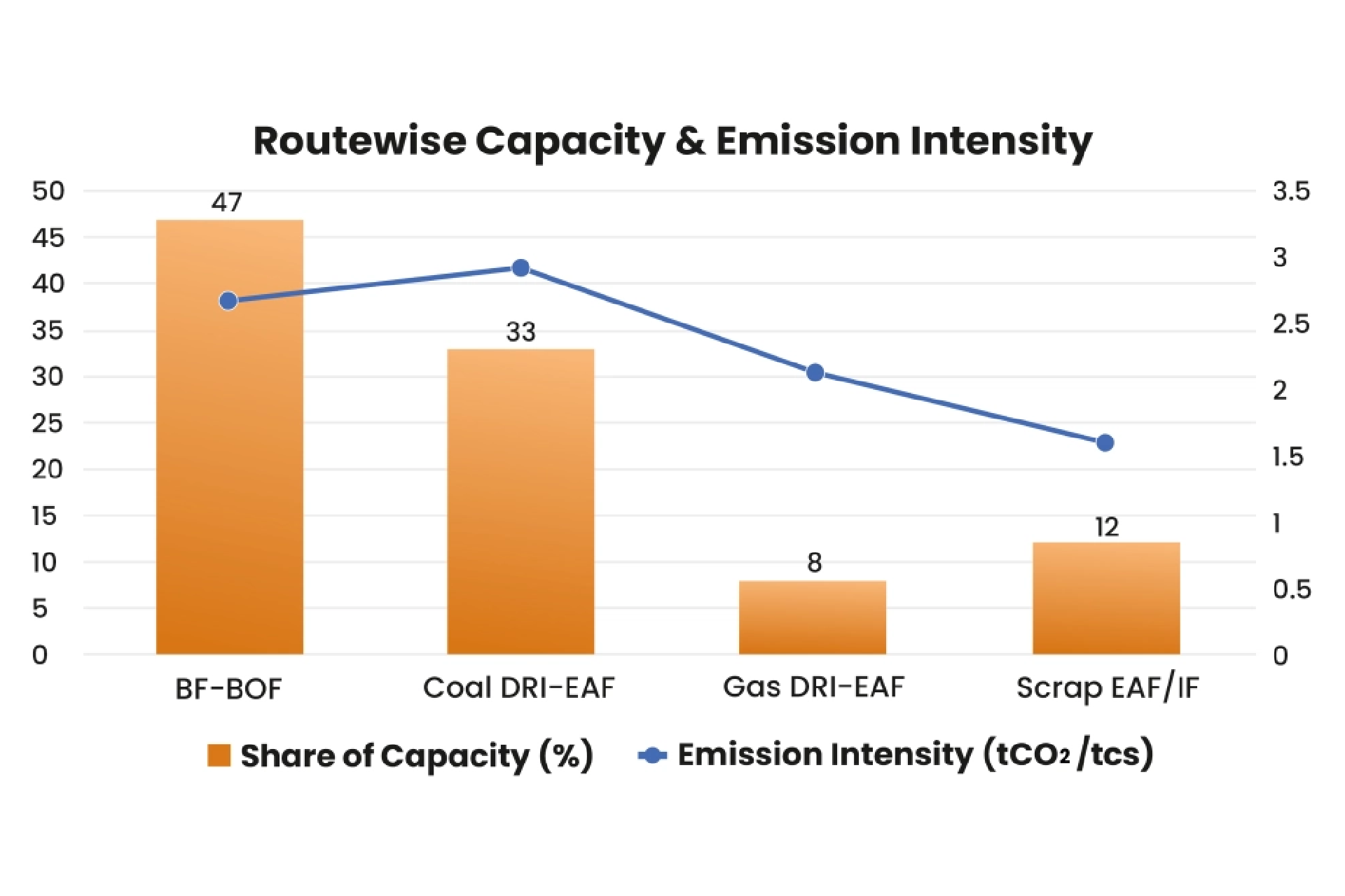 - Coal-based DRI-EAF: ~32–34% of capacity, 2.91 tCO₂/tcs — the dirtiest route.