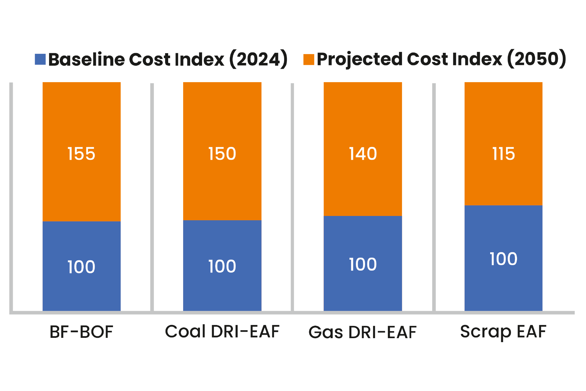 - Coal DRI-EAF: +45–55%.